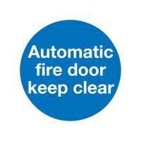 This sign informs employees, visitors and customers of an automatic fire door that needs to be kept clear